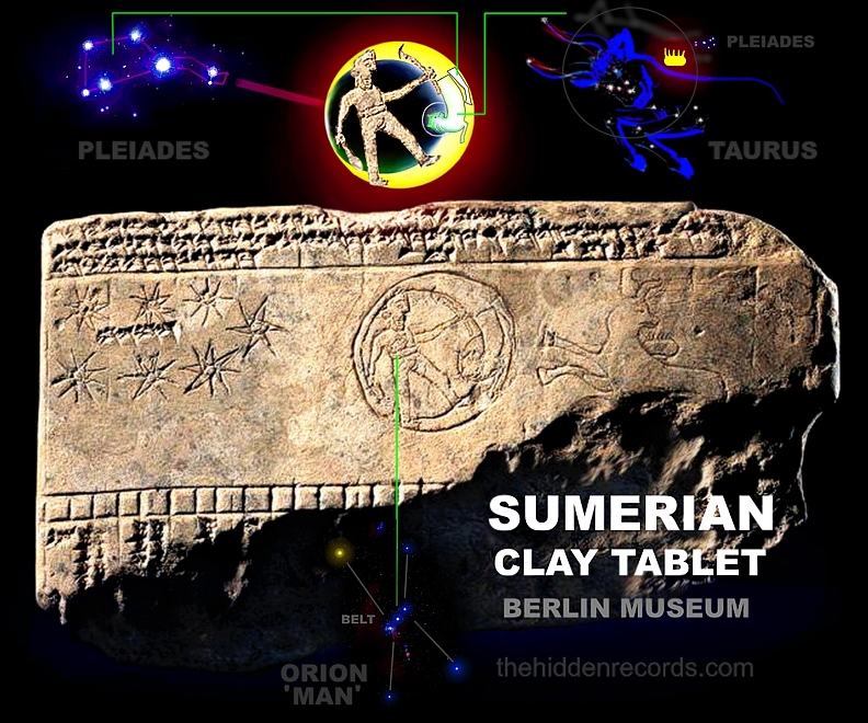 This is important in decoding his message here with the secret starmap hidden from humanity I have shown 35 strong cases of thus far. Secret human origin records hidden by historical Monarchy predecessors. He rendered a star map depiction of the place of human origins and he shows it not just accurately, but he personifies himself with his name as the Orion 'Starman' with Pleiades like the Sumerian tablet (ref).