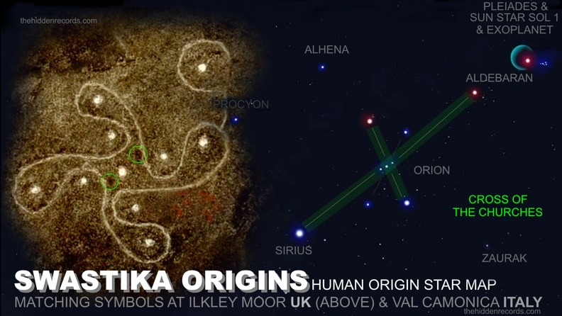 Compare in a mouse click action on the image to see the 'long' Cross version of the churches (includes Sirius and Aldebaran ... the 'CHI RHO 'short cross' uses just Orion itself). These star obsession traditions can be compared, the Cross of the churches and the swastika legend.